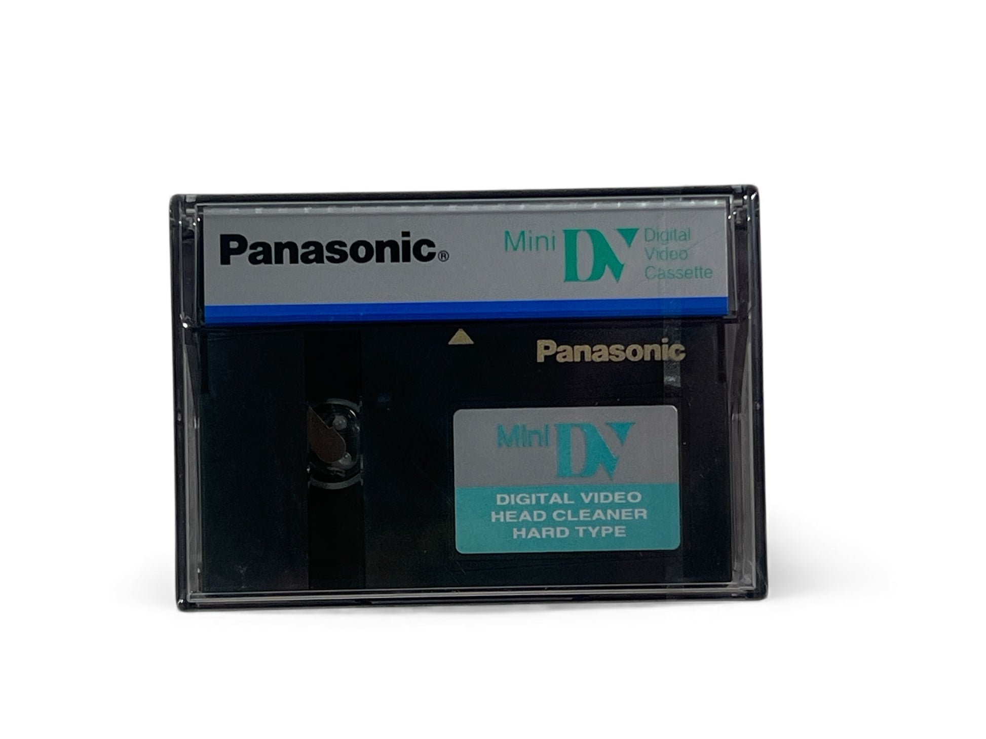 This is an original Panasonic head-cleaning cassette, compatible with most MiniDV camcorders and DV tape mechanisms.